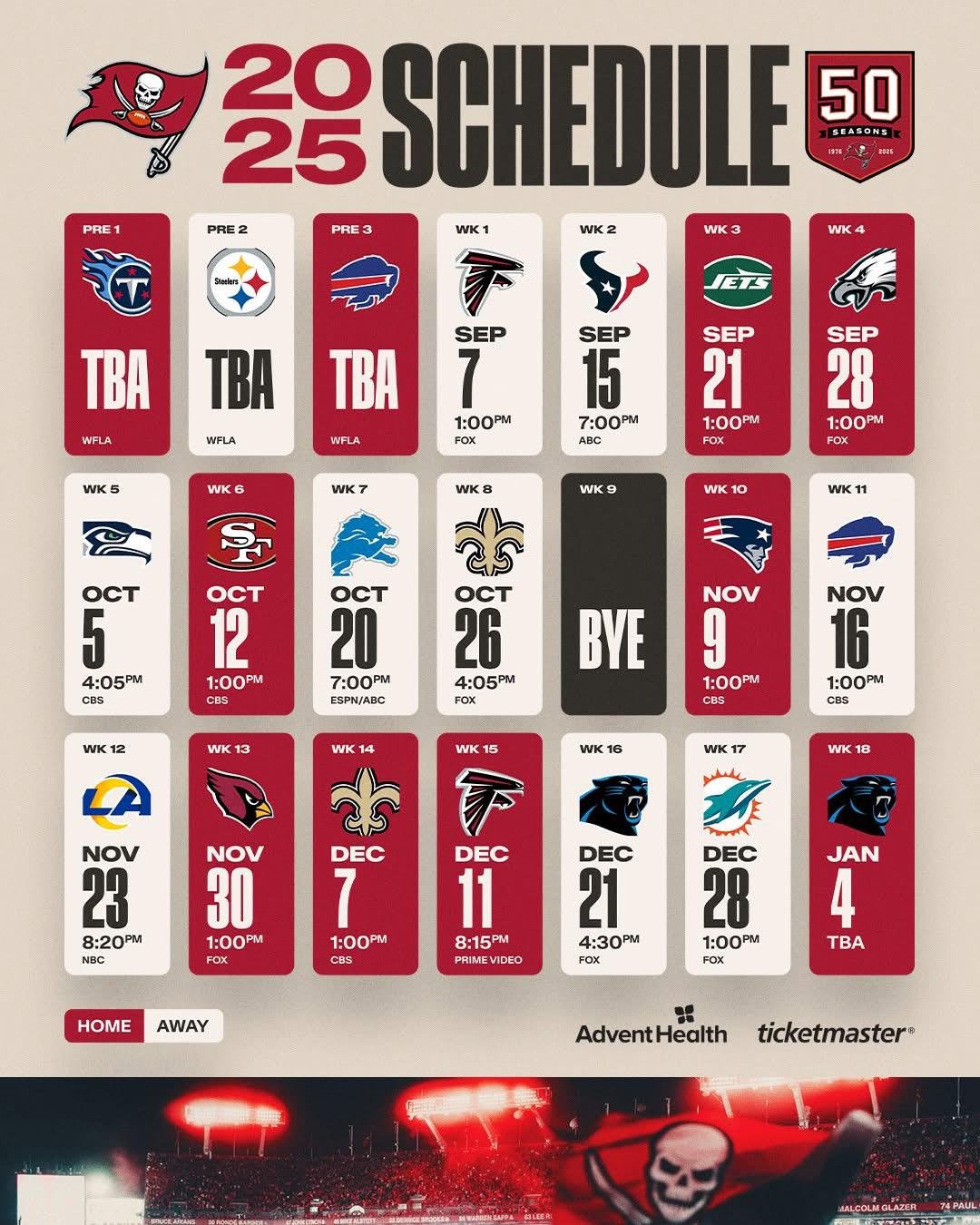• Os jogos ocorrem entre agosto e dezembro em Tampa.